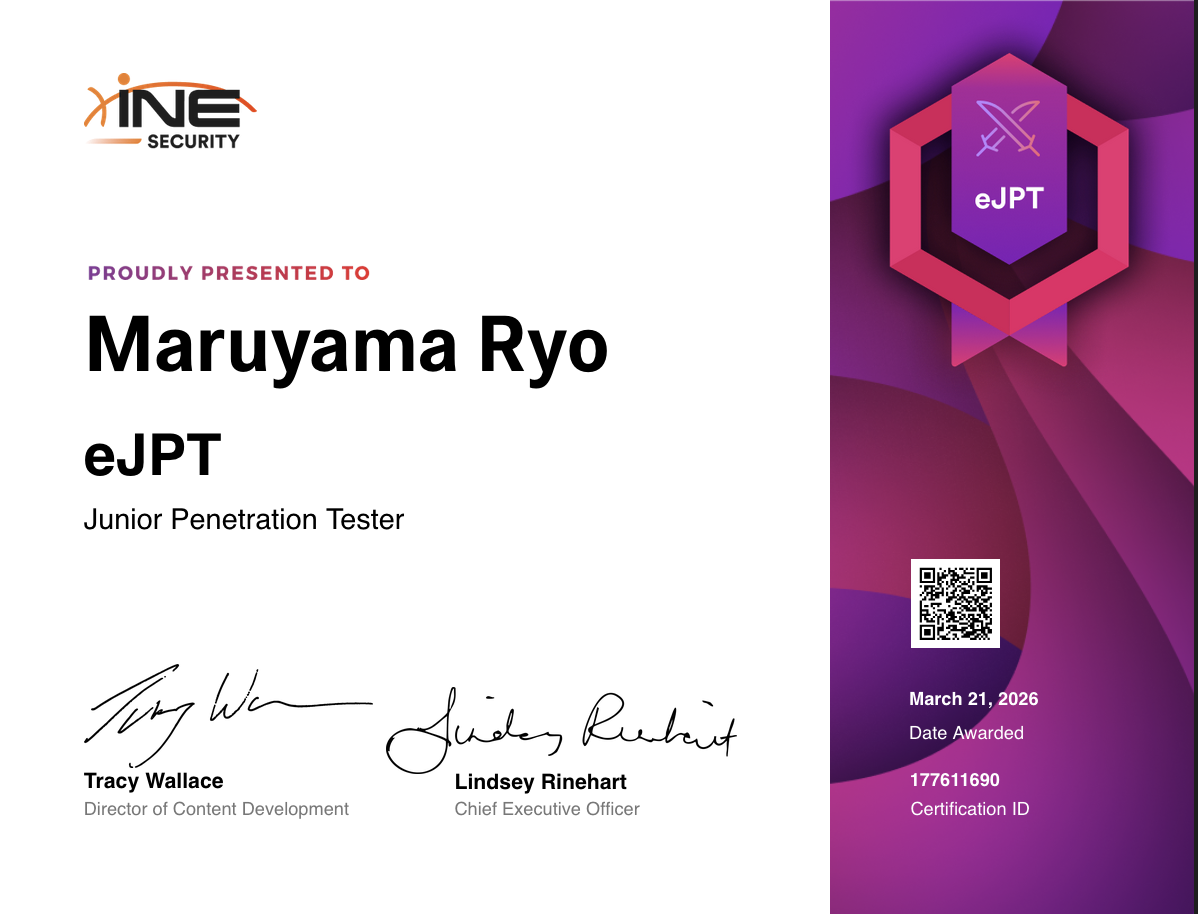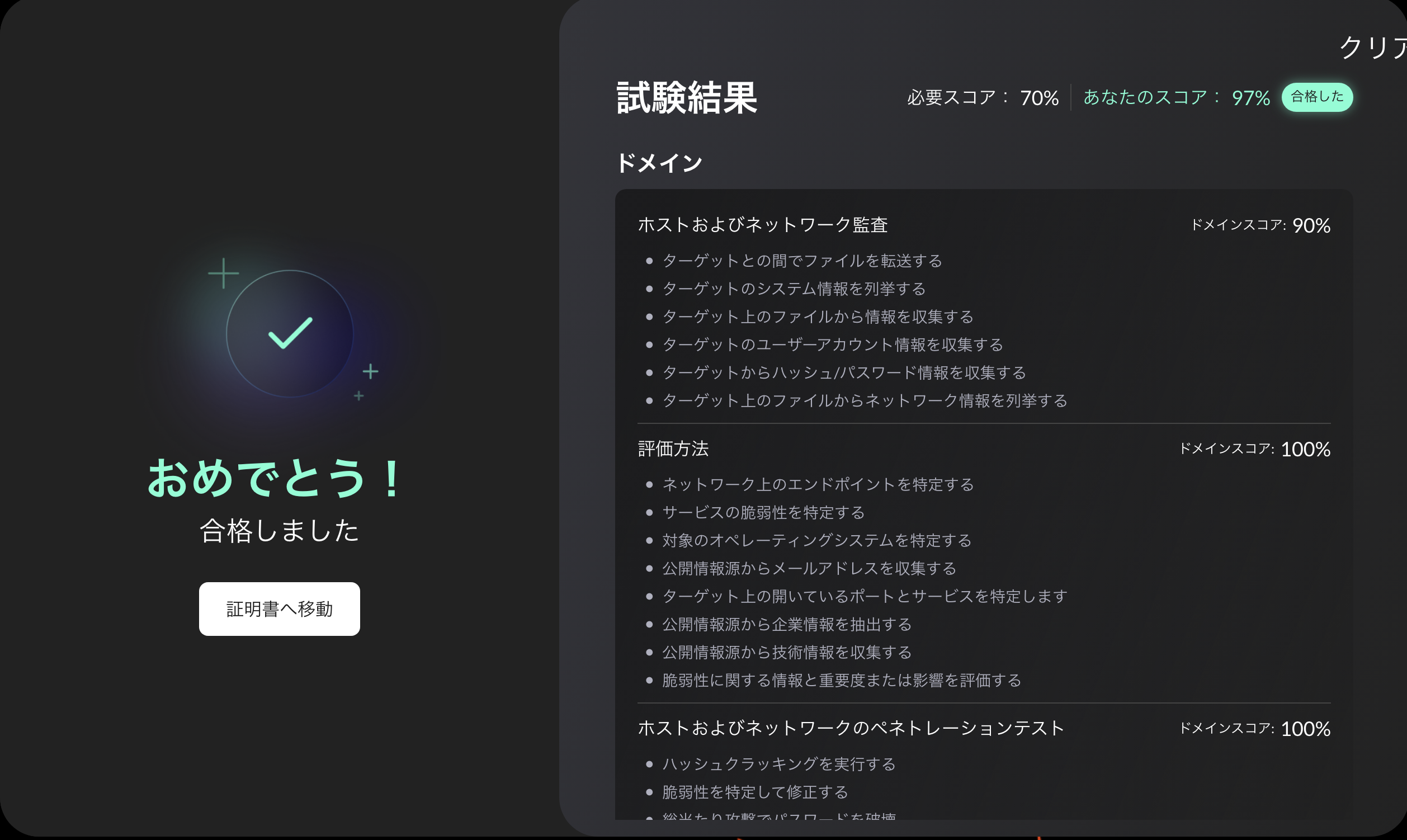 ineのペネトレーションテストの試験に合格しました! 今試験は実技試験ということもあり、48時間の試験時間が与えられます。 仮想のターゲットに対して、侵入から内部調査までの一連の攻撃プロセスを擬似的に実行し、システムの脆弱性を特定する技術を証明するものです。 理論上の知識だけでなく、45問の実技試験を通じて「実際の攻撃者がどこを狙い、どう動くのか」というリアルなリスクを深く理解 することが求められます。
