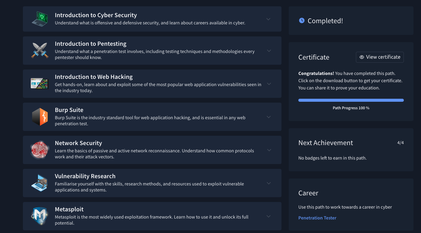 TryhackMeではJuniorPenetrationPathというコースを最初の1ヶ月ぐらいすすめていき、